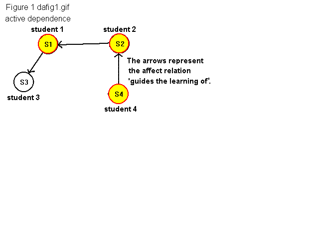 Another example of active dependence is the seen in most public high school systems. The teacher is often the sole person responsible for the affect relation "disiplining" the students in the class. In this type of system, the teacher alone has the property of active dependence with respect to the affect relation "disiplining".