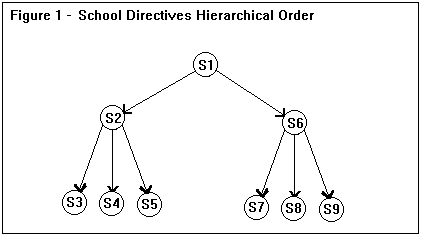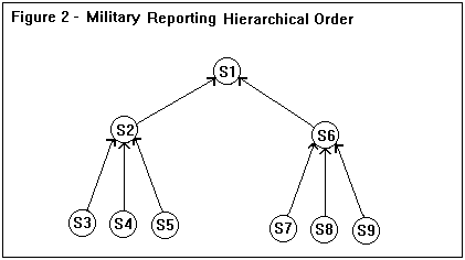 Example 2 - Another example of hierarchical order takes place in the military with a general, several colonels, and several majors. The affect relation is "reports to another." The majors report to their specific colonel, and the colonels report to the general. The general represents one level, the colonels represent a second level, and the majors represent a third level. Note that the major does not report directly to the general, and majors only report to their appropriate colonel. Also note that the channels run in the opposite direction in this example as compared to the previous example. A graphic representation of this might look like Figure 2. S1 represents the general, S2 and S6 each represent a colonel, and S3, S4, S5, S7, S8 and S9 each represent a major.