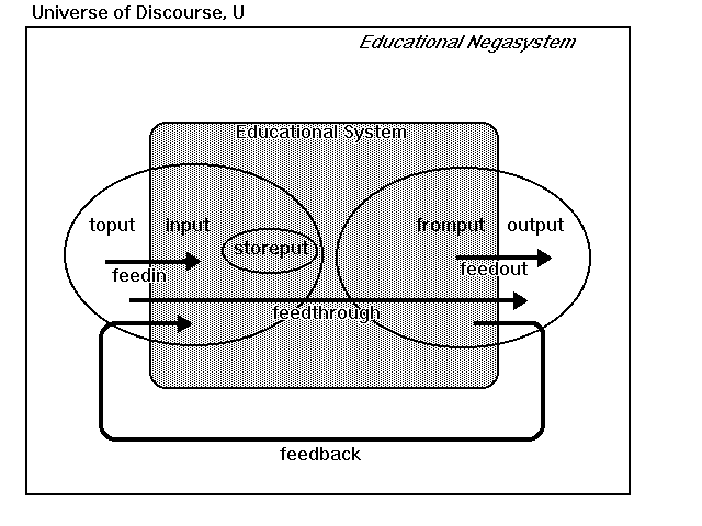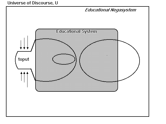 The SIGGS system properties, both structural and dynamic, can provide us with concepts and principles in order to understand existing educational systems in new ways. For example, I have known for some time about the power and influence that the textbook adoption committees in Texas, New York and California have had on the textbook publishing industry. It did not occur to me that this was an example of filtration until I tried to generate examples of this negasystem property.The hypothesis that: "If filtration increases, then uncertainty in system input categories decreases" got me to thinking further. Input is 'selective information' in a system. 'Information' in the SIGGS theory is a characterization of occurrences through use of categories in a classification (a technical meaning from information theory). 'Selective information' means that there is uncertainty in the distribution of alternative categories. For example, if there are only two kinds of textbooks taken in by a system (such as math and history), and the probability of observing a math book is .90, versus .10 for a history book, then there is little uncertainty in the classification of textbooks. On the other hand, if the probability of a math book being observed is .50 and likewise for a history book, then uncertainty is maximum (for when there are two alternatives). An H measure from information theory can be used to indicate the uncertainty in a probability distribution of discrete alternatives.