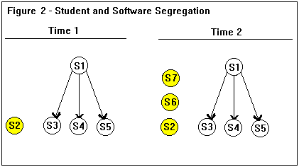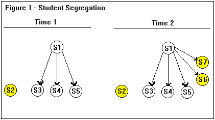 Example 2 - Another example of segregation also takes place in a classroom with a teacher, several students, and a computer. The computer is not used by the teacher or the students for the affect relation "guides the learning of another." This is at time 1, and the computer is independent form the teacher and students. At time 2, new educational software programs are brought into the classroom. The new software is also not used by the teacher or students, and is considered independent. A graphic representation of this might look like Figure 2. S1 represents the teacher, S3, S4, and S5 represent the students, S2 represents the computer, and S6 and S7 represent the educational software.