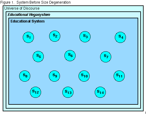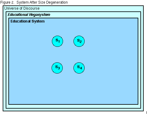 Figures one and two show a decrease in the number of students within an educational system and hence size degeneration. Size degeneration can also occur when other components such as the teacher(s) or administrator(s) leave the educational system. This can happen for a number of reasons including a decrease in enrollment, cutbacks, and even the flu.